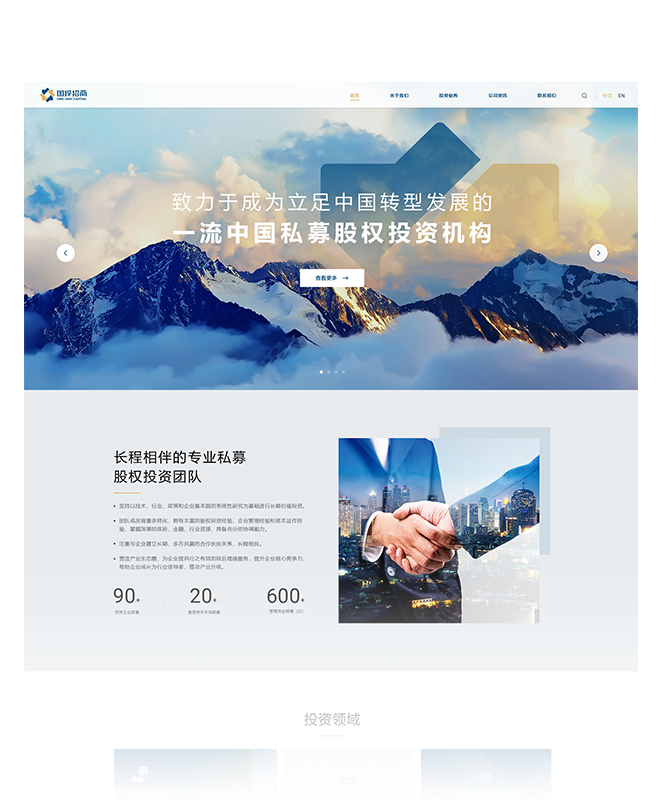 體現(xiàn)國投招商定位未來工業(yè)、專業(yè)金融感受為設(shè)計方向,結(jié)合現(xiàn)在主流扁平化、交錯呼應(yīng)的設(shè)計手法,賦予頁面效果達到穩(wěn)重高級且變化的呈現(xiàn)效果。