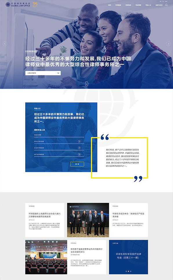 賦予頁面效果簡約高端國際水準的呈現(xiàn)效果 ,體現(xiàn)環(huán)球律所的放眼國際和行業(yè)專業(yè)水準。