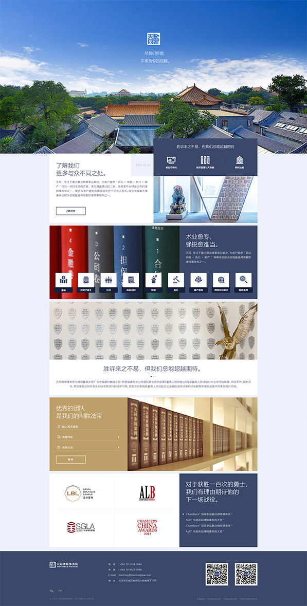 天同律所給人以深刻印象的,不止是那座紫禁城邊古韻風(fēng)雅的傳統(tǒng)四合院,還有那些前沿領(lǐng)先的信息科技工具和運(yùn)營成果。這些特點(diǎn)的疊加使天同律所官網(wǎng)的形象設(shè)計(jì)策略更加與眾不同,我們幫助擁有高顏值+技術(shù)流的天同律所在眾多律所品牌中脫穎而出。