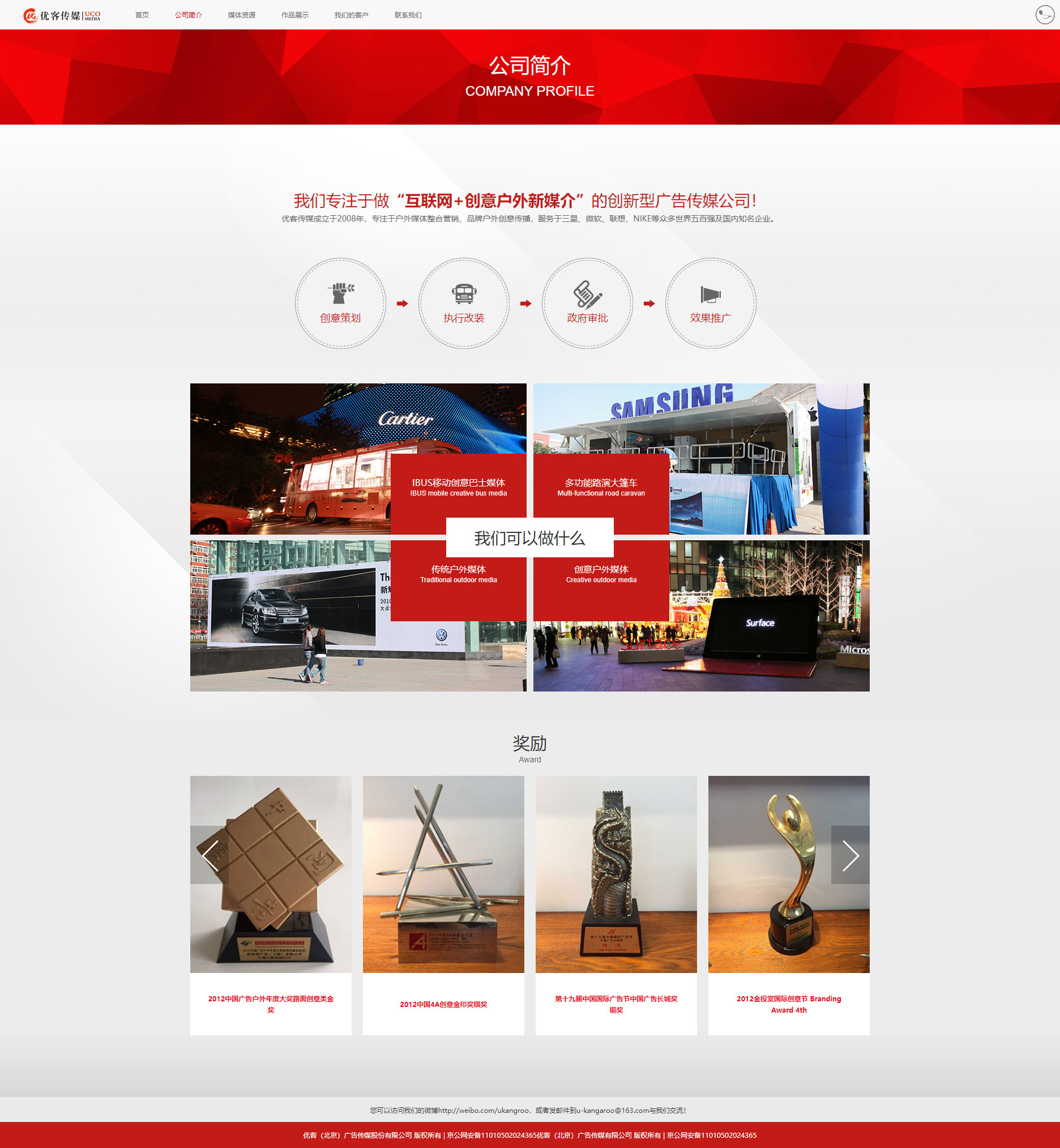 優(yōu)客傳媒成立于2008年,專注于戶外媒體整合營銷、品牌戶外創(chuàng)意傳播,服務(wù)于三星、微軟、聯(lián)想、NIKE等眾多世界五百強(qiáng)及國內(nèi)知名企業(yè)。